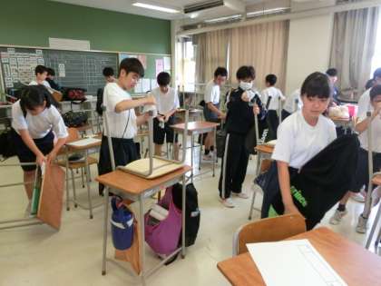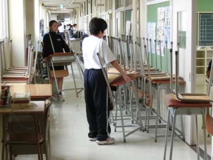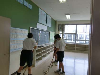 1学期お世話になった教室などをみんなで綺麗にしています。まずは机・椅子のゴミ取りをし、廊下に出して、教室内を掃いて・・・