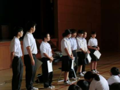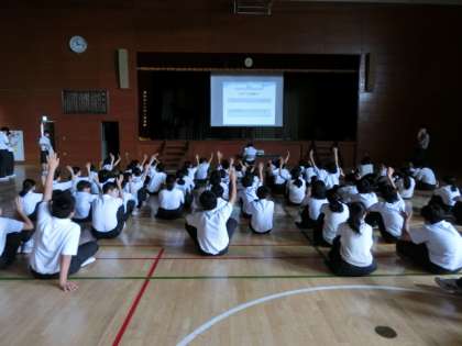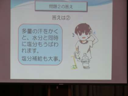 保健給食委員がクイズ形式で、「熱中症について」の問題を作成し、2択でみんなに手を上げて貰い、正解を!タイムリーな素晴らしい発表でした。