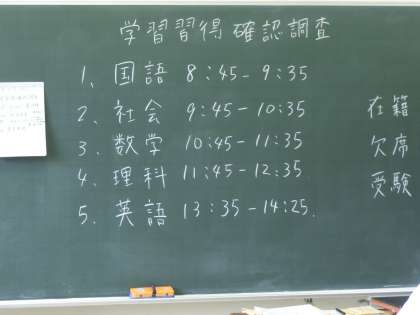3年生は2回目の区の学習習得確認調査を朝から5時間行っています。この結果は進路指導の資料にもなります。第3回は10月30日です。しっかり頑張れ〜!