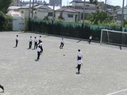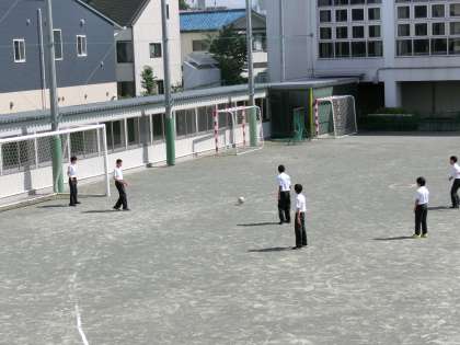 今日は3年生が修学旅行でいないので、1・2年生がサッカーをしています。