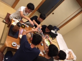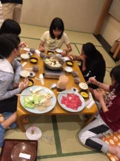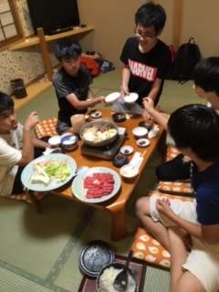 お部屋ですき焼きです。ほうじ茶でカンパイ!