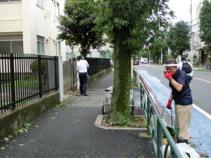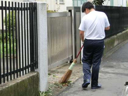 2年生は今日から3日間職場体験です。午後から、パン屋さんに行く男子は、午前中学校の主事さんに付いて、夜中の台風で散らかった落ち葉はきを。