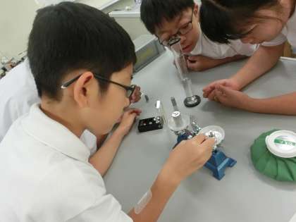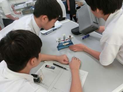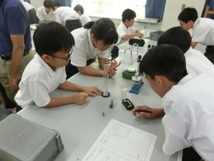物質の質量と体積を測っています。どの重さにする?と相談しながら真剣に取り組んでいます。