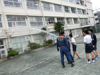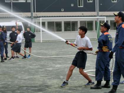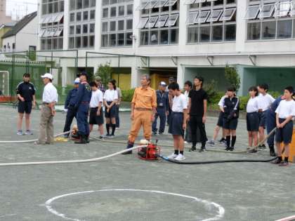 地域班ごとに2グループに分かれて、それぞれ体験します。D級ポンプは校舎の火の模様の的に向かって放水しています。