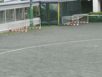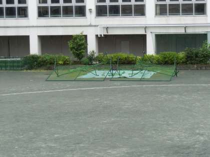 明日の台風19号対策で、校庭のゴールを横にしてロープで結わき、防護ネットもねかせて固定しました。少しでも被害が出ないように、主事さんたちが見回って準備をしてくださってます。皆さんのご家庭も、しっかり準備をしてください。
