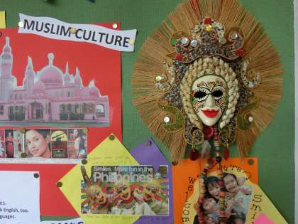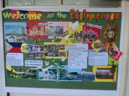 ALTのウイリー先生が、出身のフィリピンの国の楽しい紹介を作って掲示してくれています。お祭りの時につけるお面などカラフルで、自然が豊かな素敵な国だなあ〜と見とれました。