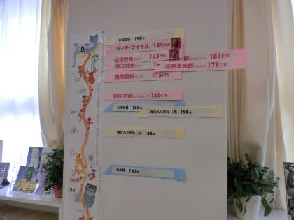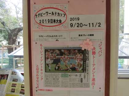 13日も感動を貰ったラグビーワールドカップの日本代表の選手の背の高さが、柱に追加になり、昨日の昼休みに盛り上がったと。「リーチマイケル選手はこんなに大きい?稲垣選手の方が大きいと思った。」「田中選手は166センチなのに凄いよねえ。」「福岡カッコいいよなあ〜」と。次の南アフリカにも勝つように、応援しよう!