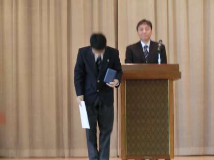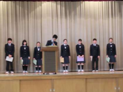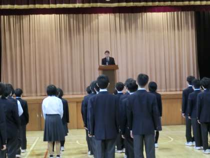 全校朝礼では、校長先生から、授業態度や人の話をじっくり聞いて行動しようというお話がありました。1年生が英語スピーチコンテストで2位・美術部で応募した作品が入賞した表彰の後、生徒会朝礼があり、各委員長から、10月の反省や今月の取り組み課題について発表がありました。
