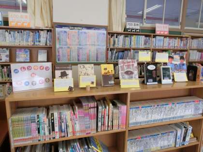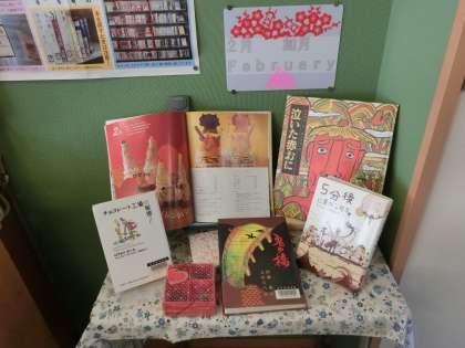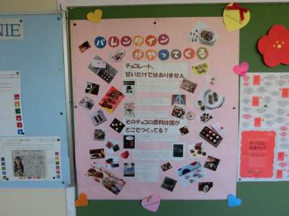 バレンタイン特集を廊下の壁と本棚の上に関連本は置かれています。足を運んで、手に取って見てください。