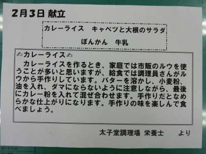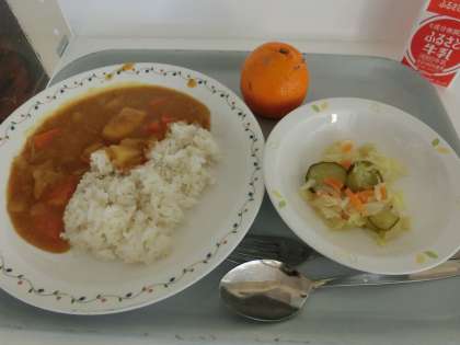 本日の献立は「カレーライス、キャベツと大根のサラダ、ぽんかん、牛乳」です。