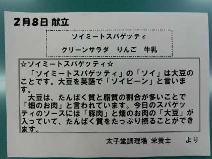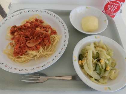 本日の献立は「ソイミートスパゲッティ、グリーンサラダ、りんご、牛乳」です。