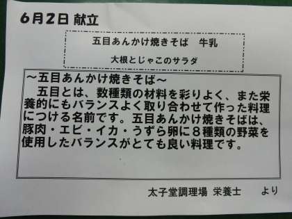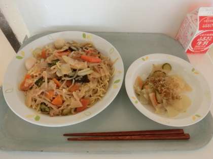 本日の献立は「五目あんかけ焼きそば、大根とじゃこのサラダ、牛乳」です。