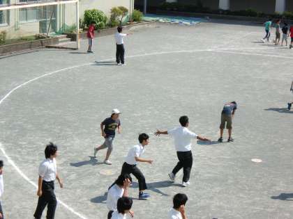 昼休みの校庭、小学生と中学生がいっしょにサッカーをしている光景も見られました。