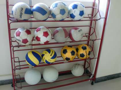 ボール、4段目が小学校から運ばれてきたボール、上が中学校の学年別のボール、違いが見られます。 小学生は、どうも、中学生用を使っているようです。