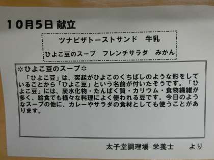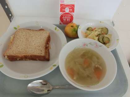本日の献立は「ツナピザトーストサンド、ひよこ豆のスープ、フレンチサラダ、みかん、牛乳」です。