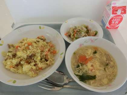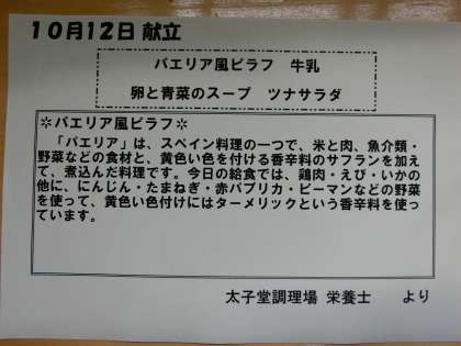 本日の献立は「パエリア風ピラフ、卵と青菜のスープ、ツナサラダ、牛乳」です。