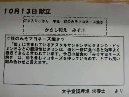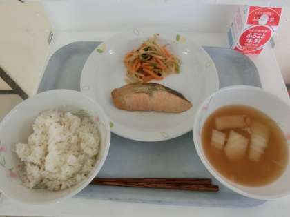 本日の献立は「ごま入りごはん、鮭のみそマヨネーズ焼き、からし和え、みそ汁、牛乳」です。