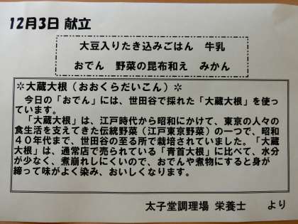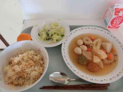 本日の献立は「大豆入りたき込みごはん、おでん、野菜の昆布和え、みかん、牛乳」です。