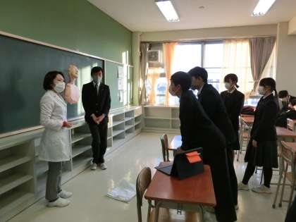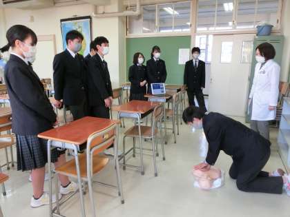 保健給食委員会では、救急救命講習として、医療用マネキンを使って胸骨圧迫による心臓マッサージのデモンストレーションを行いました。正しいリズムと姿勢でできるよう生徒も体験しました。また、いざという時のために校内のAEDの設置場所を再確認しました。(太子堂中は1階の東側トイレの前と体育館に設置されています)