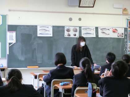 2月4日、1年日本文化(食)の授業では、「食物と自然」 保存 について学びました。魚の名前あてクイズでは、写真を見ながら、鰤・鱈・鰯 など魚の名前と旬の季節について問題が出されました。おなじみの魚ですが、難問答えられたかな。