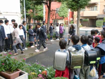 今月は、小学生が中学校へ来ての『ふれあい挨拶デー』です。8時前から小学生が中学校に来て、30名ほどが中学生を迎えました。 中学校は、中間考査のテスト中で、いつもよりは参加生徒が少なかったようです。