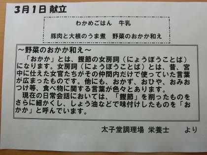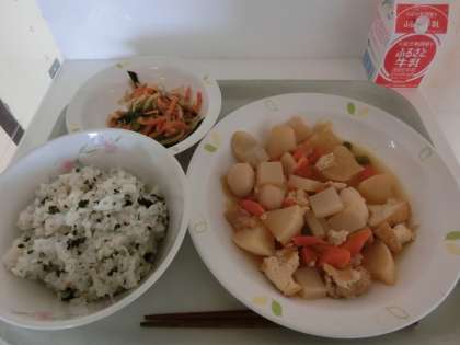 本日の献立は「わかめごはん、豚肉と大根のうま煮、野菜のおかか和え、牛乳」です。