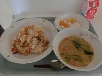本日の献立は「かにちらし寿司、かきたま汁、フルーツ杏仁、牛乳」です。