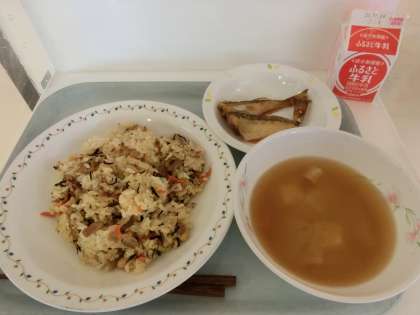 本日の献立は「大豆入りひじきごはん、豚汁、小魚のから揚げ、牛乳」です。