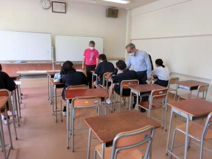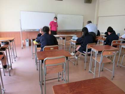 少人数クラスで、因数分解に挑戦していました。7名の生徒に対して、先生と退職ボランティアの方が、きめ細やかに一人一人に分かるまで解き方を教え、学習をすることができました。