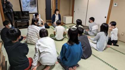 班長会議で、今日の反省と明日の班行動時の諸注意などを確認しています。