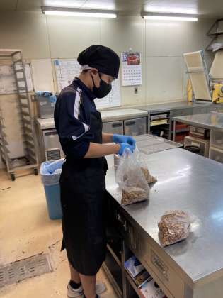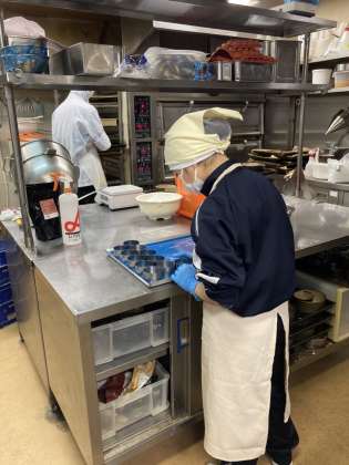 一人はケーキの型を鉄板にきっちりと並べる作業、もう一人は胡桃を細かく砕く作業を行っています。