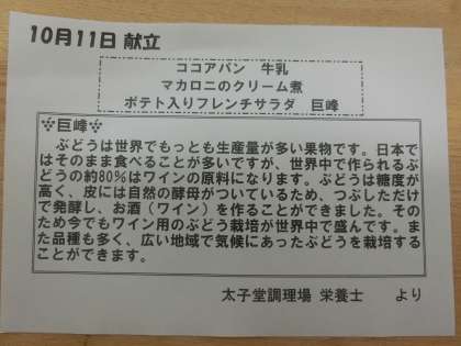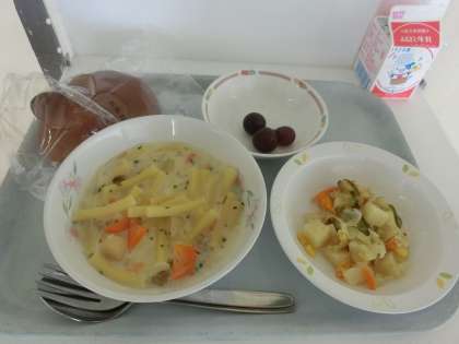 本日の献立は「ココアパン、マカロニのクリーム煮、ポテト入りフレンチサラダ、巨峰、牛乳」です。