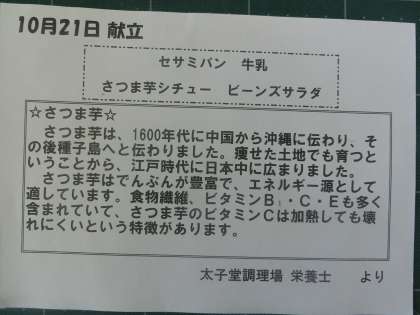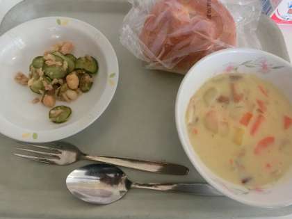 本日の献立は「セサミパン、さつま芋シチュー、ビーンズサラダ、牛乳」です。