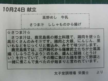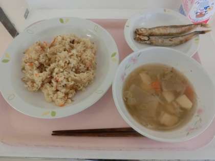 本日の献立は「高野めし、さつま汁、ししゃものから揚げ、牛乳」です。