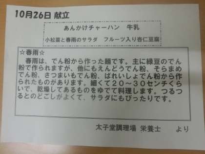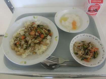 本日の献立は「あんかけチャーハン、小松菜と春雨のサラダ、フルーツ入り杏仁豆腐、牛乳」です。