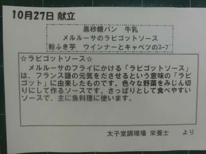 本日の献立は「黒砂糖パン、メルルーサのラビゴットソース、粉ふき芋、ウインナーとキャベツのスープ、牛乳」です。