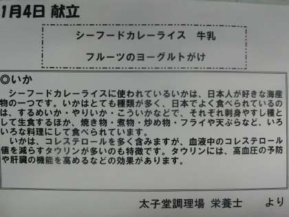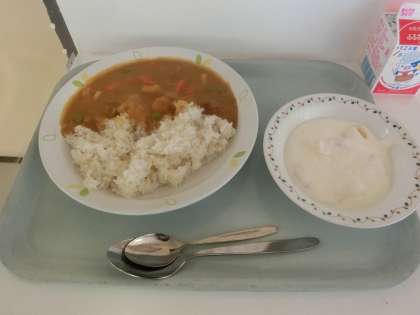 本日の献立は「シーフードカレーライス、フルーツのヨーグルトがけ、牛乳」です。