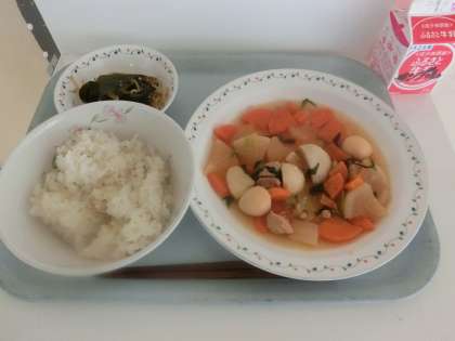 本日の献立は「じゃこごはん、豚肉と大根のうま煮、もやしとわかめのごま酢和え、牛乳」です。