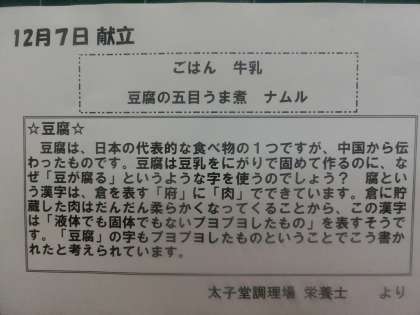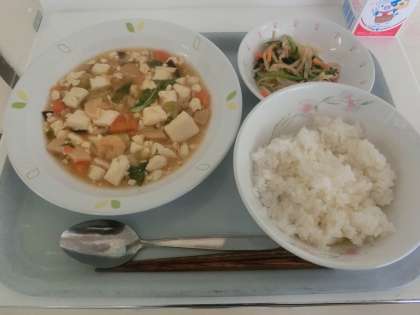 本日の献立は「ごはん、豆腐の五目うま煮、ナムル、牛乳」です。