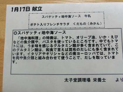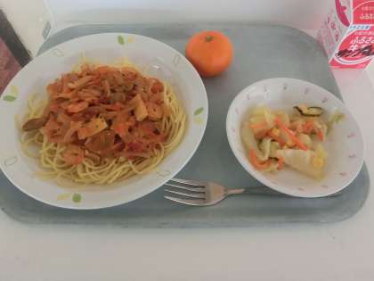 本日の献立は「スパゲッティ地中海ソース、ポテト入りフレンチサラダ、くだもの(みかん)、牛乳」です。