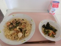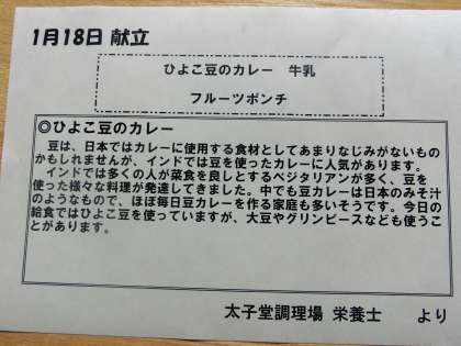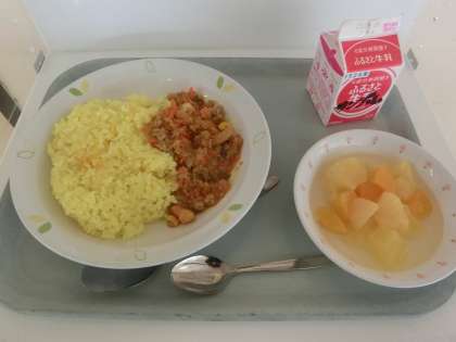 本日の献立は「ひよこ豆のカレー、フルーツポンチ、牛乳」です。