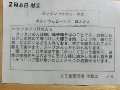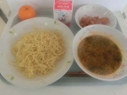 本日の献立は「タンタンつけめん、カルシウムビーンズ、ぽんかん、牛乳」です。