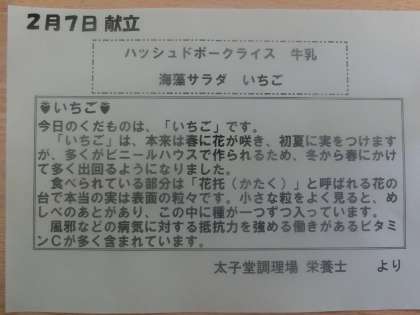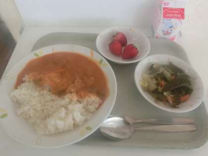 本日の献立は「ハッシュドポークライス、海藻サラダ、いちご、牛乳」です。