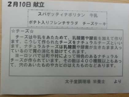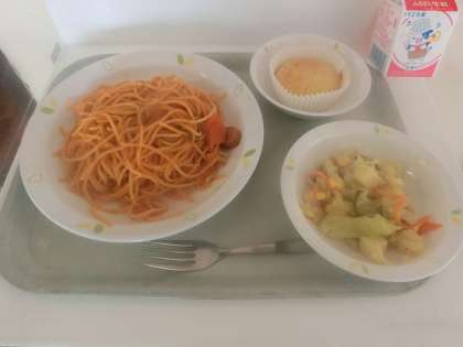 本日の献立は「スパゲッティナポリタン、ポテト入りフレンチサラダ、チーズケーキ、牛乳」です。