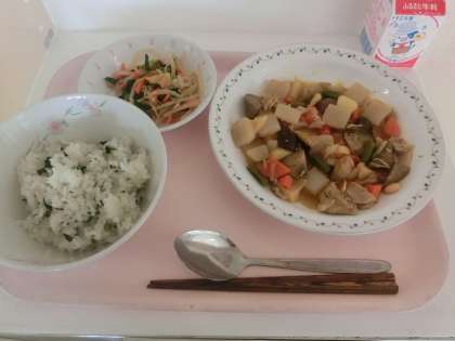 本日の献立は「わかめごはん、豆入り筑前煮、おひたし、牛乳」です。