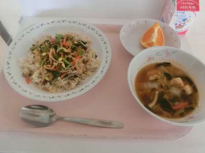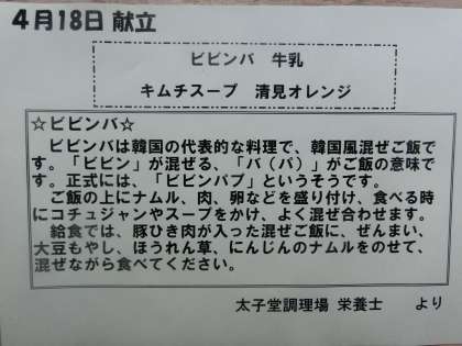 本日の献立は「ビビンバ、キムチスープ、清見オレンジ、牛乳」です。