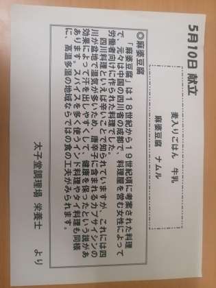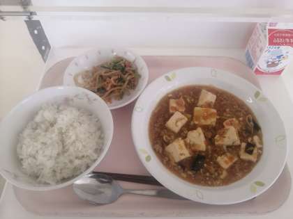 本日の献立は「麦入りごはん、麻婆豆腐、ナムル、牛乳」です。