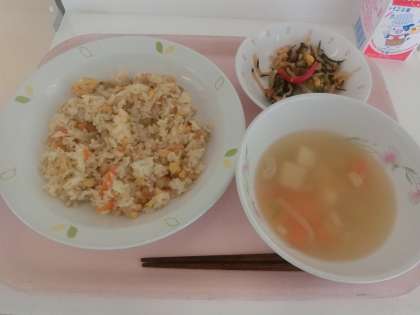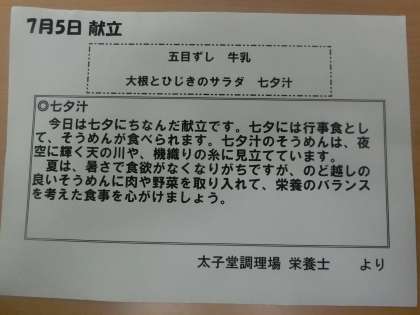 本日の献立は「五目ずし、七夕汁、大根とひじきのサラダ、牛乳」です。