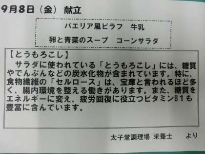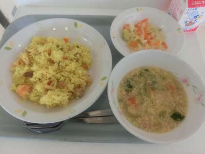 本日の給食は、「パエリア風ピラフ、卵と青菜のスープ、コーンサラダ、牛乳」です。