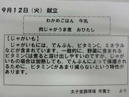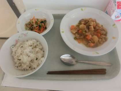 今日の給食は「わかめごはん、肉じゃがうま煮、おひたし、牛乳」です。